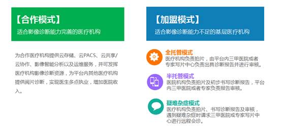 其次,針對不同醫(yī)院影像業(yè)務的實際難題的不同,平臺具備多種服務模式,可滿足不同醫(yī)院的業(yè)務需求。針對影像診斷能力較強的醫(yī)院,采用“合作模式”,為醫(yī)院提供云存儲、云PACS、云共享/云協(xié)作、影像智能分析以及運維服務。并可發(fā)揮醫(yī)療機構(gòu)影像診斷資源,為平臺內(nèi)其他醫(yī)療機構(gòu)提供閱片診斷,實現(xiàn)醫(yī)生多點執(zhí)業(yè),增加醫(yī)院 收入。針對影像診斷能力較弱的醫(yī)院,采用加盟模式,并提供全托管、半托管、疑難雜癥模式供選擇,形成了多種模式并行的影像運營服務體系。