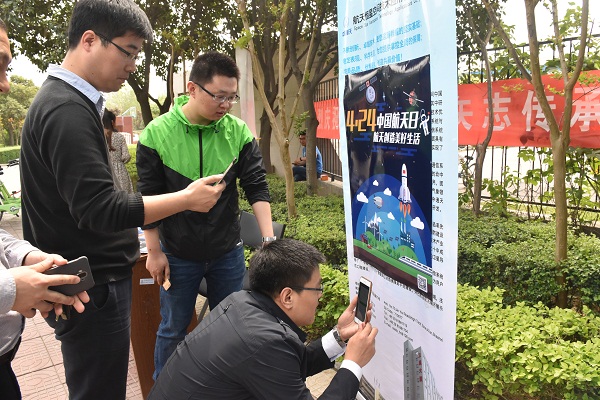 4月24日上午,航天恒星(西安)團總支成員和青年員工走上街道,為路過園區的行人義務講解航天知識,并發動路人以微信掃描二維碼的方式,進一步關注和了解航天知識。